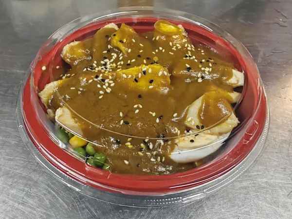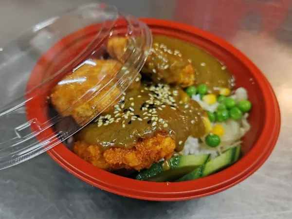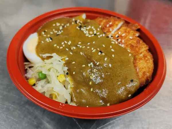 Sliced Chicken Breast in Breadcrumb topped with Curry sauce, served with boiled Egg, crunchy Cabbage & steamed Rice, sprinkled with sesame seeds.
