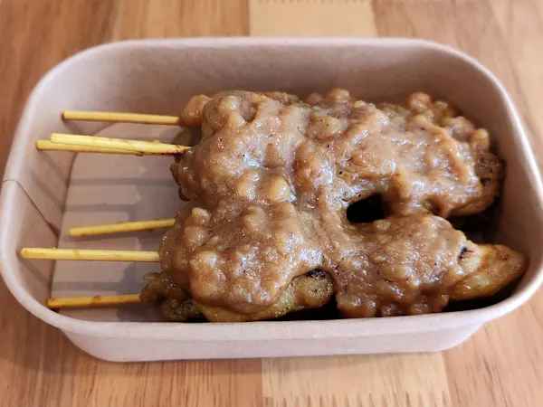 Tender stir-fried chicken tossed in a rich, savoury peanut-based satay sauce with a hint of spice. It's topped with fresh spring onions and served with a boiled egg and steamed rice.