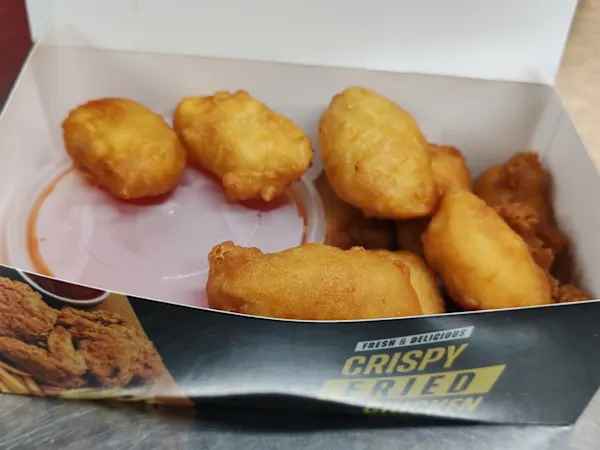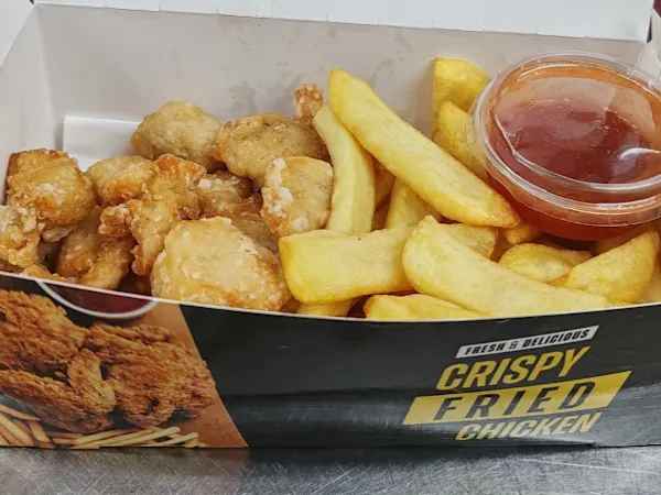A mixed box of fried Chicken , Chicken Balls, mini chicken nuggets and Chips