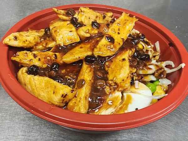 Tender pieces of chicken breast stir-fried in our chef’s special sauce, crafted from fermented broad beans. This signature sauce delivers a salty, umami-rich flavour with subtle sweetness and a mellow finish, served alongside steamed rice and a boiled egg.