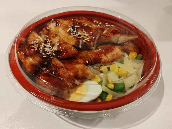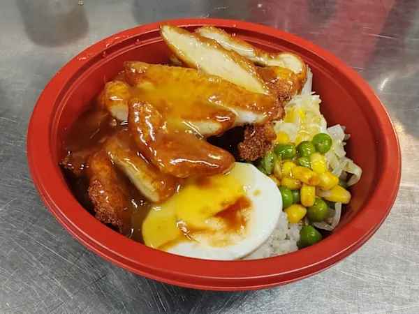 Sliced Breadcrumb Chicken breast, topped with Teriyaki sauce, served with boiled Egg, crunchy Cabbage & steamed Rice, sprinkled with sesame seeds.