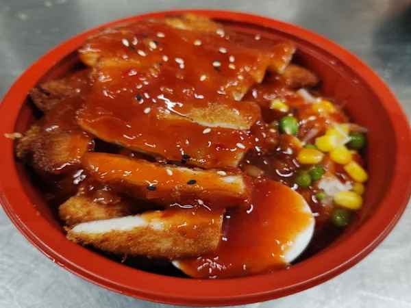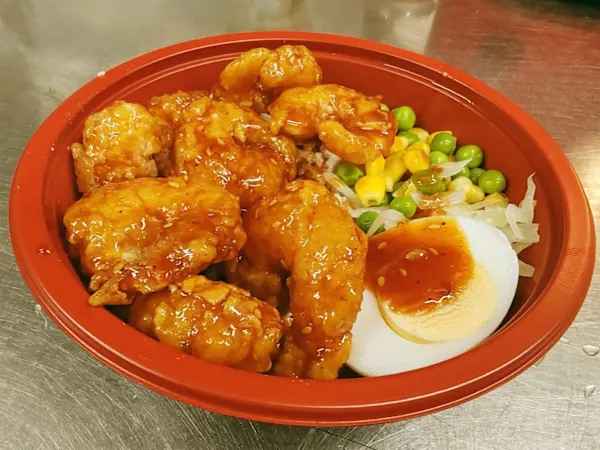 Thin battered Chicken coated in spicy, sweet & sticky Korean sauce, sprinkled with sesame seeds, served with boiled Egg and steamed Rice