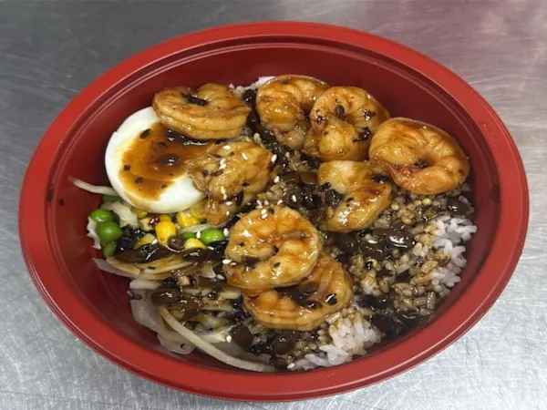 Prawns coated in spicy, sweet & sticky Korean sauce, sprinkled with sesame seeds, served with boiled Egg and steamed Rice