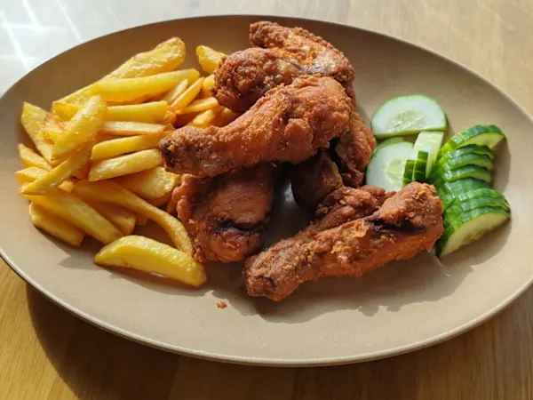 Fried Chicken with sweet chilli sauce, garnished with some cucumbers, spring onions.