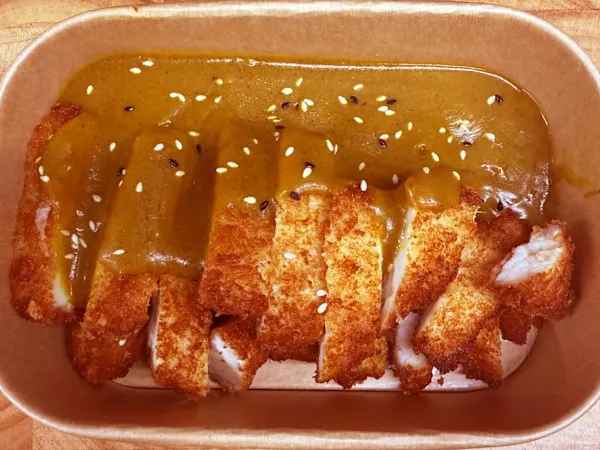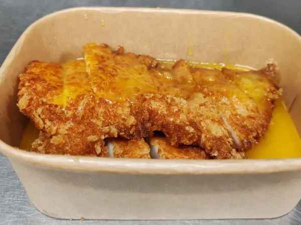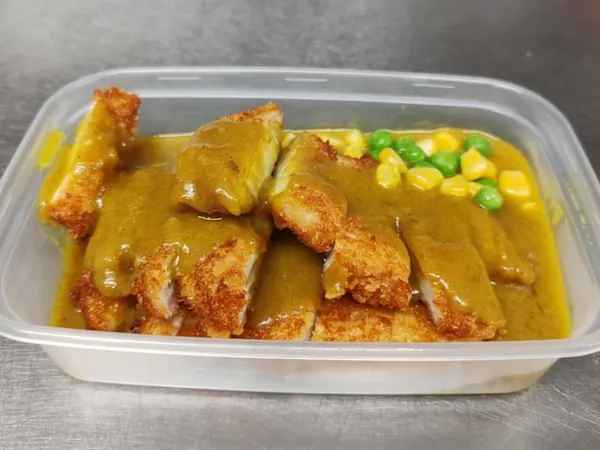 Sliced breadcrumbed chicken breast, topped with rich curry sauce.