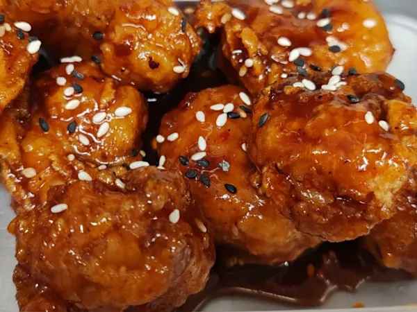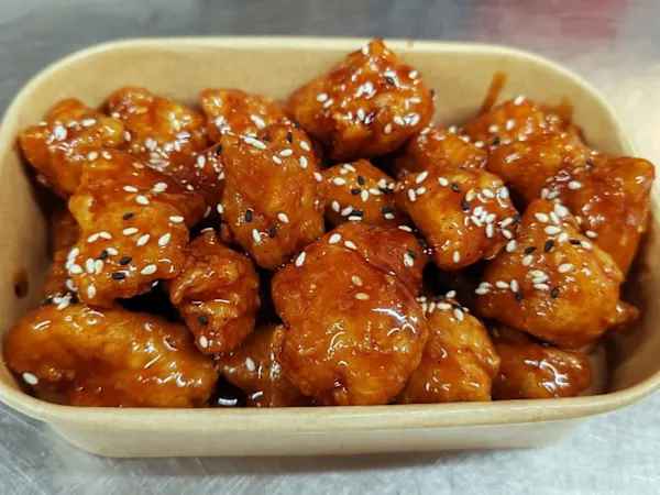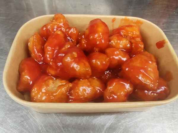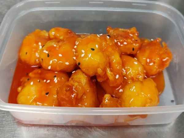 Battered Chicken glazed with home made sweet and spicy sauce