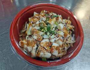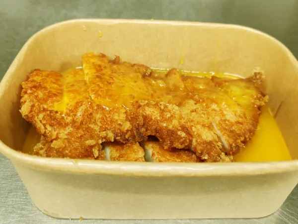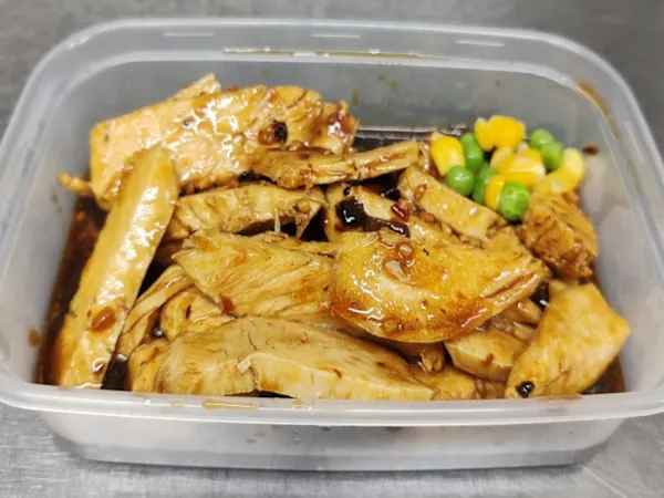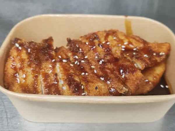 Sliced breadcrumbed chicken breast, topped with Teriyaki sauce.