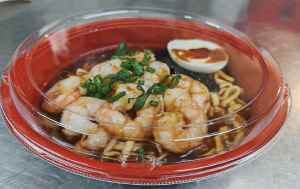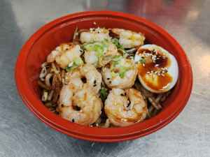 Springy Noodle with a savoury sauce, served with Prawns and boiled Egg