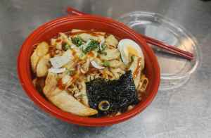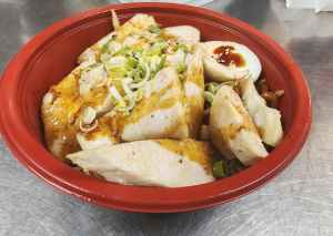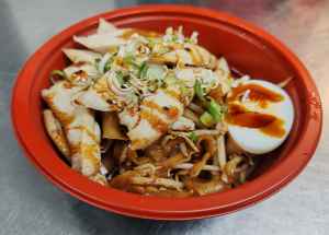 Thick springy Japanese Noodle topped with a savoury sauce, served with Chicken and boiled Egg.