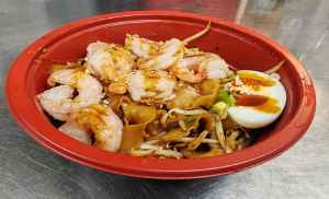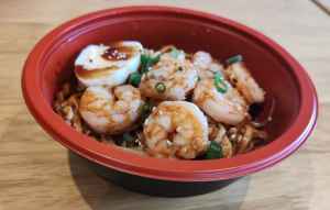 Springy Noodles cooked with a spicy flavours sauce, served with Prawn and boiled Egg