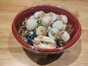 Thick springy Japanese Noodle topped with a savoury sauce, and served with Fish Balls and boiled Egg.