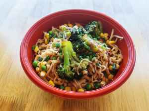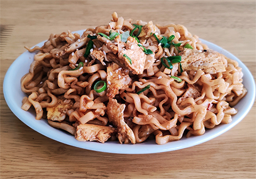 Ramen noodles stir-fried with egg and drizzled with savory teriyaki sauce for a delightful side dish.