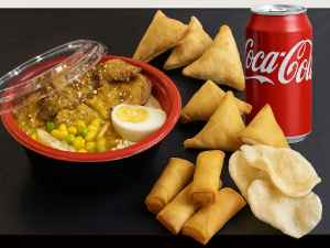 1 Bento Bowl + 4 Spring Rolls , 4 Samosas, Prawn Cracker