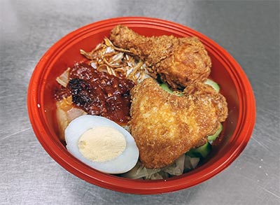 Fragrant Rice cooked in Coconut Milk, served with 2 pieces of fried Chicken, Anchovies, baked Peanuts, Sambal Sauce, boiled Egg, crunchy Cabbage & Cucumber.